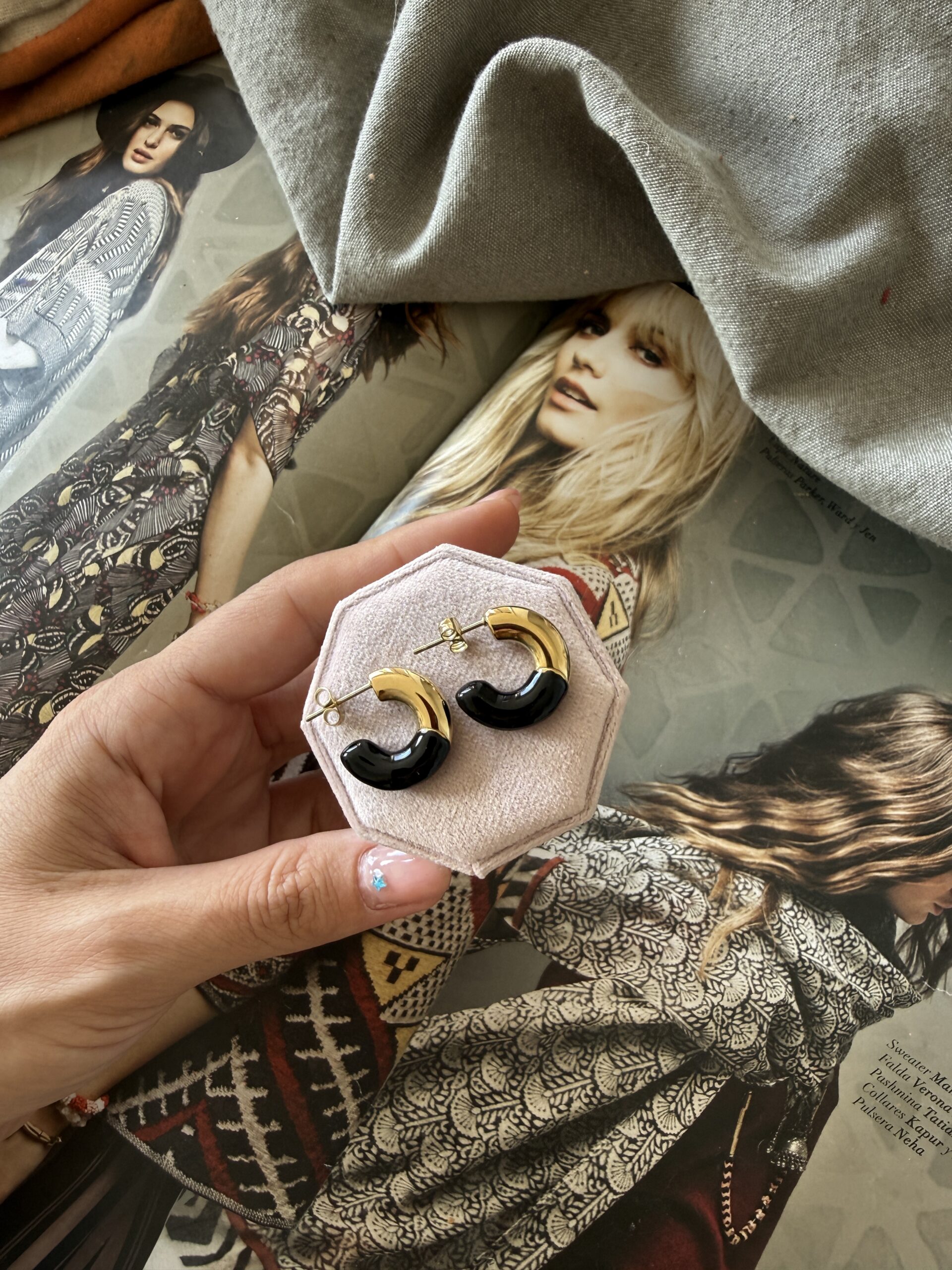 Aros argolla de acero quirúrgico doradas y negras de 2 cm diámetro. Cierre con tuerquita.