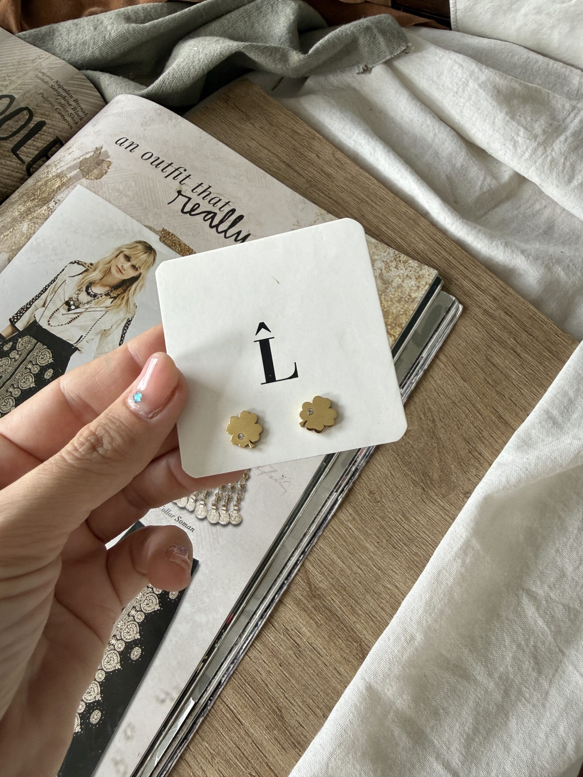 Aros de acero quirúrgico dorado con palito pasante y tuerquita son con forma de trebol de 1 cm de diámetro y una piedrita incrustada.