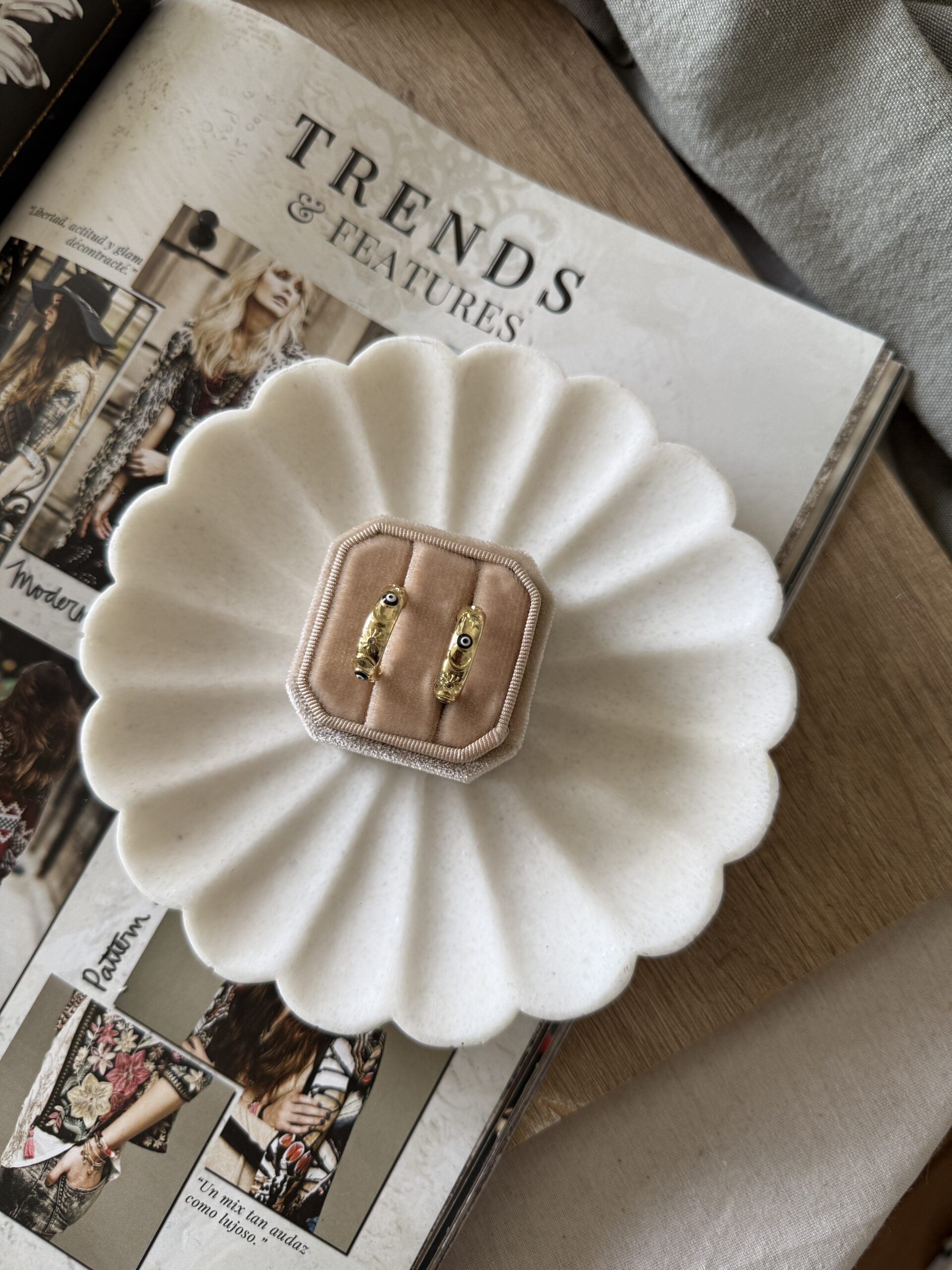 Aros argolla de 2cm de diámetro bañados en oro, con ojo protectores en negro. Cierre con palito pasante.