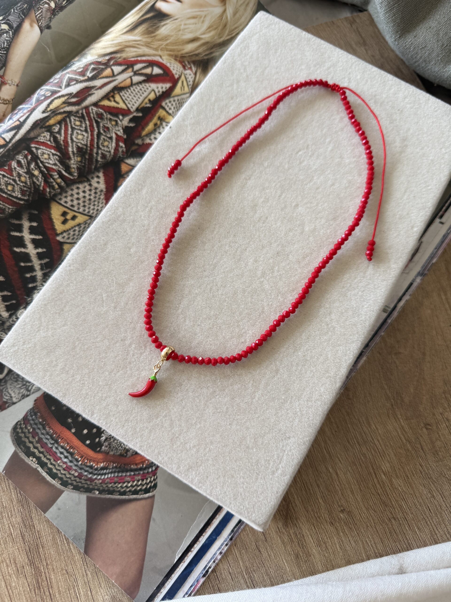 Collar regulable de cristales de roca color rojo con ají de la suerte. Lo podes usar largo o corto! Resistente al agua!