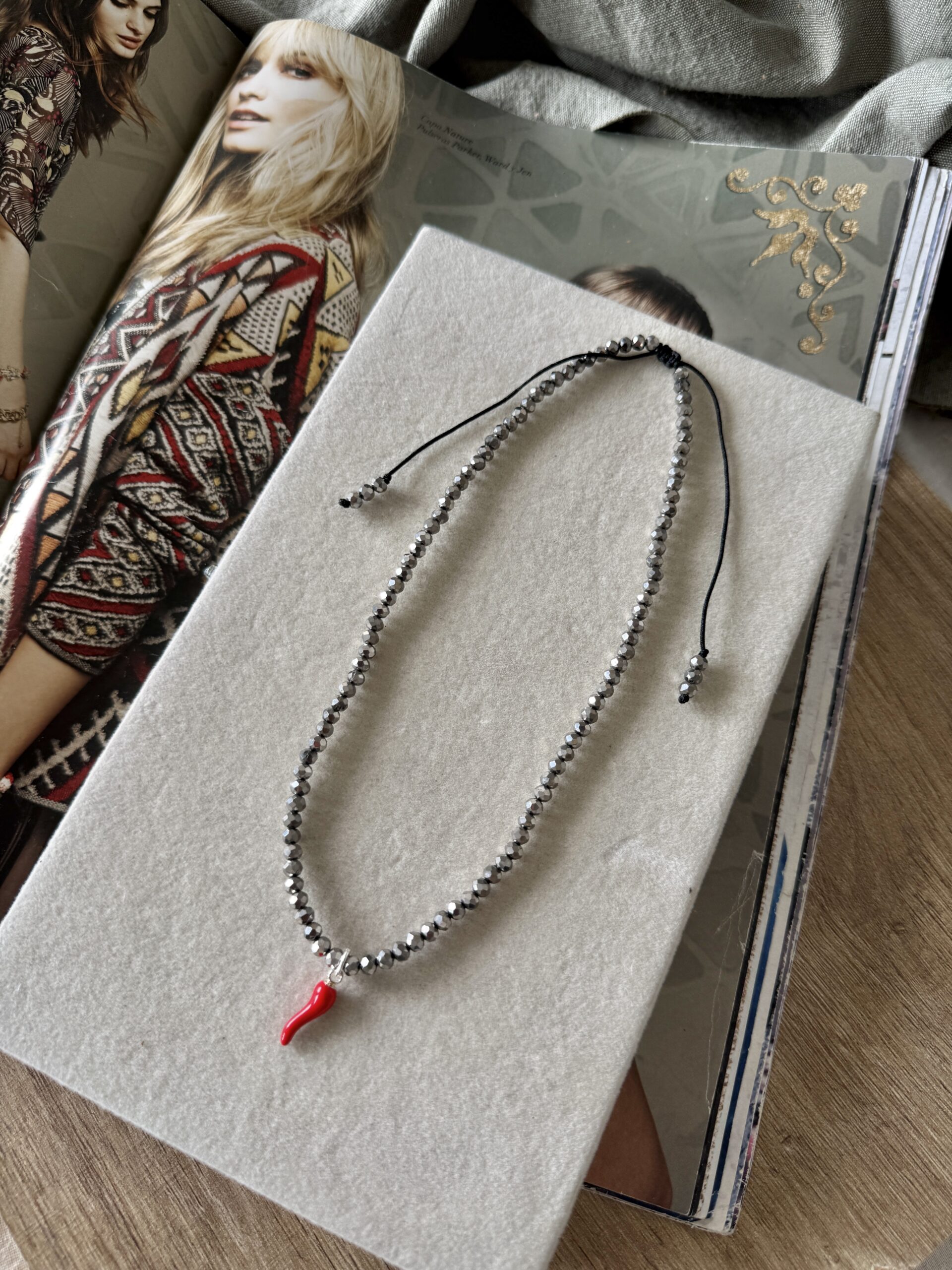 Collar regulable de cristales de roca plateados y dije de ají de la suerte. Resistente al agua!
