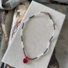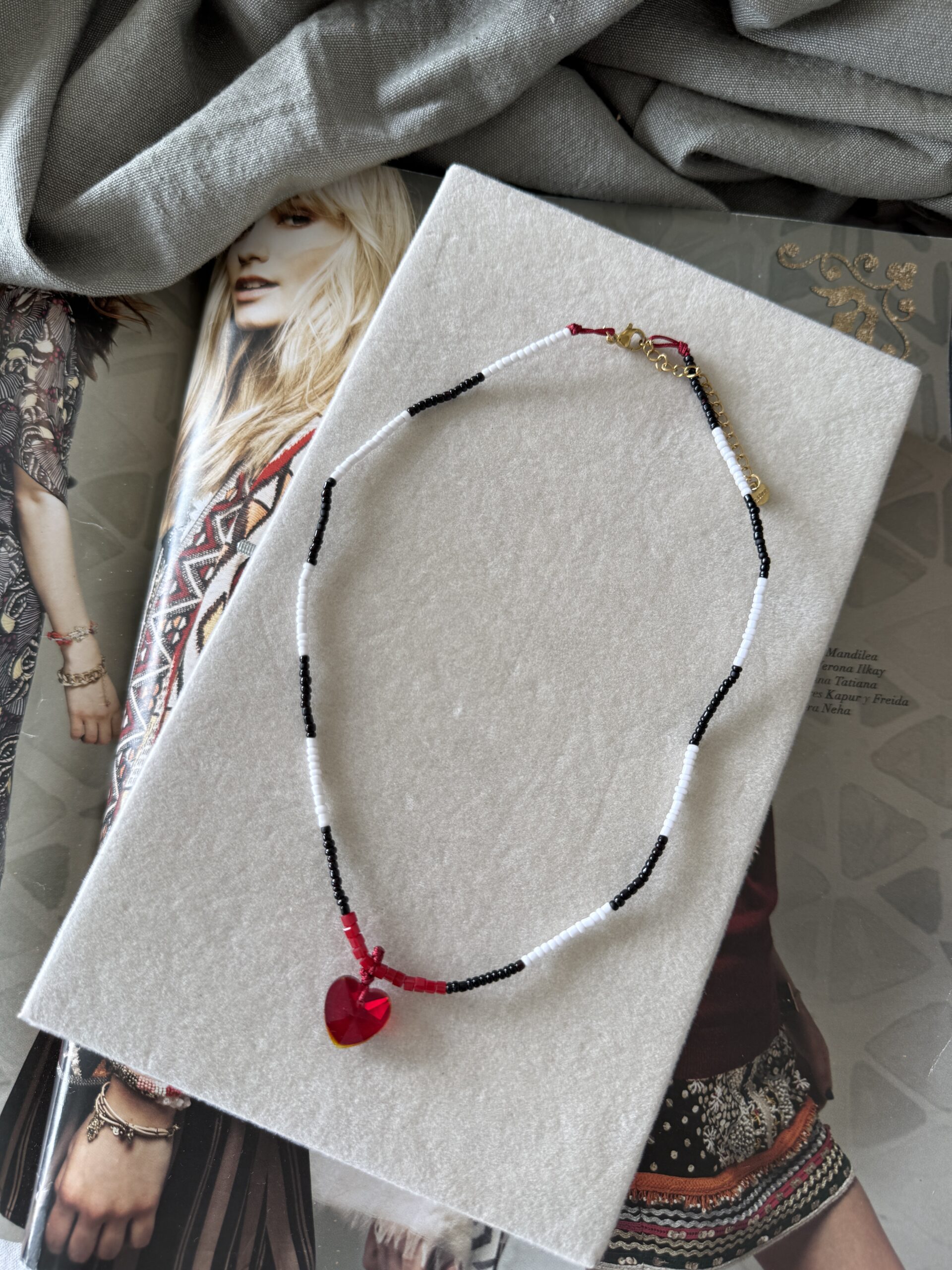 Collar regulable de 40 cm de largo + 5 cm de cadena regulable con mini mostacillas, cristales y dije de corazón de cerámica con ojito protector.
