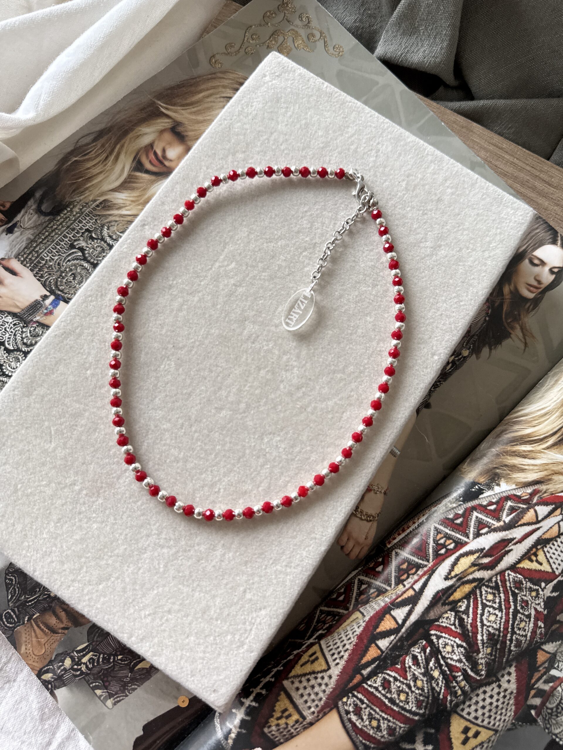 Collar regulable de 38 cm de largo + 5 cm de cadena de alargue. Con cristales de roca y pelotitas plateadas de metal. Ideal para usar cortito y combinarlo con otro que tenga dije 😉