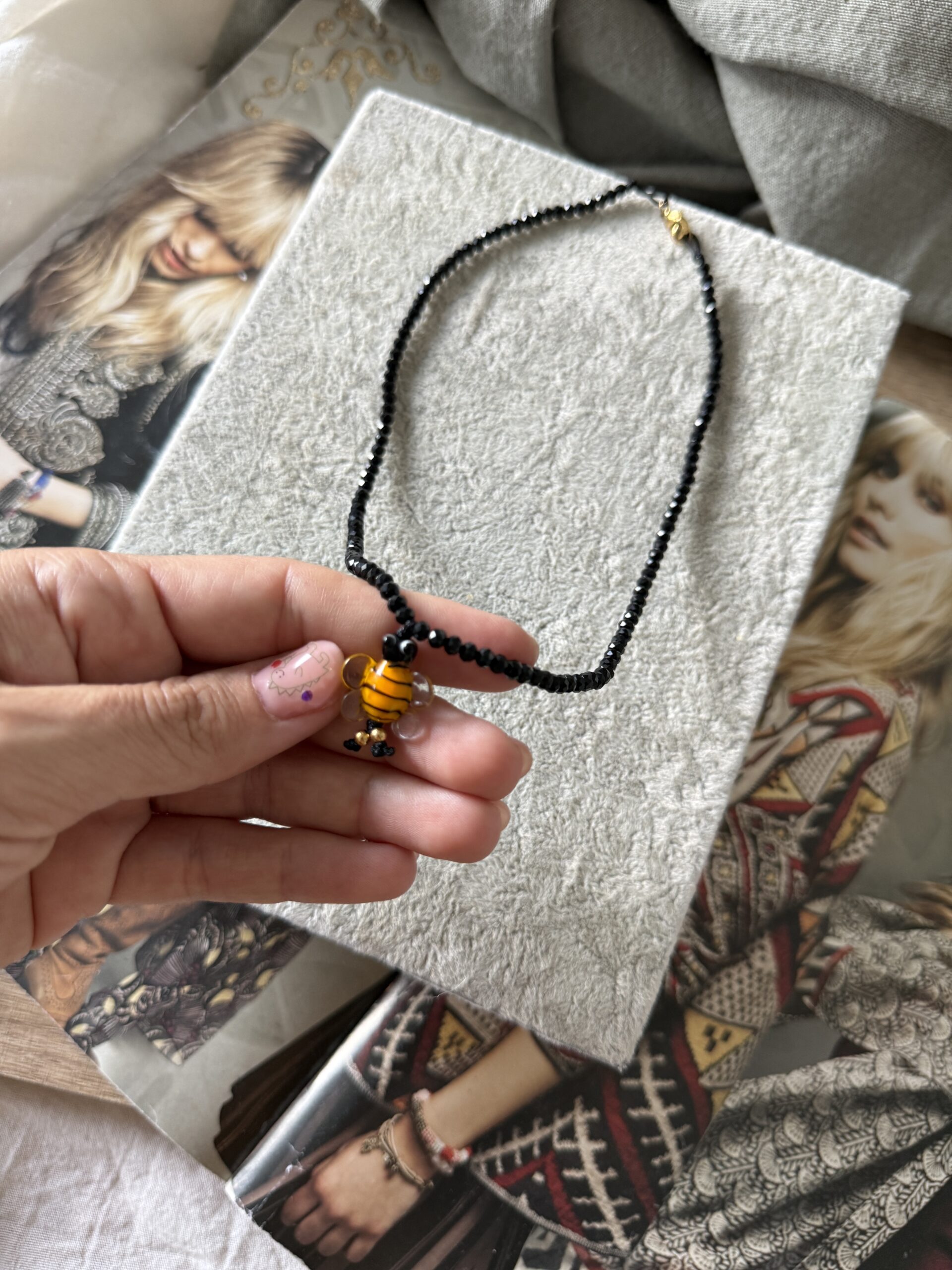 Collar regulable de cristales negros con dije de abeja de vidrio de murano. Resistente al agua.
