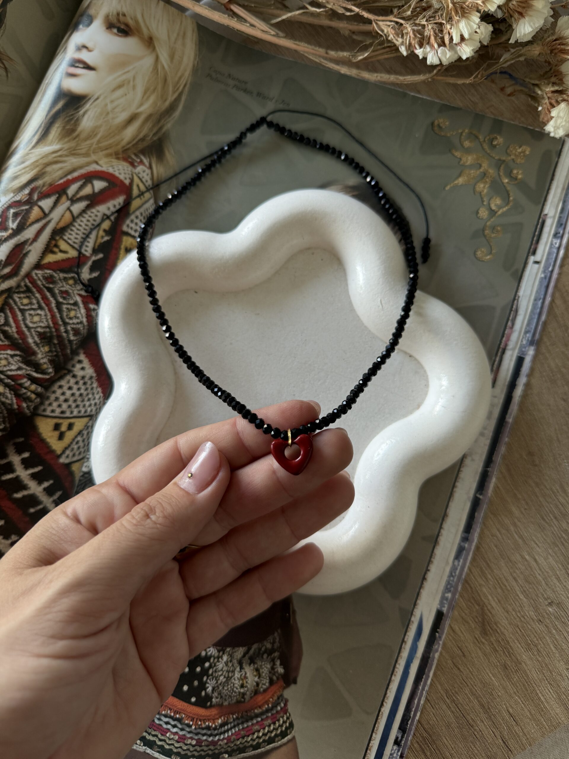 Collar regulable de cristales de roca negros con dije de Donna de corazones en bordo! Resistente al agua!