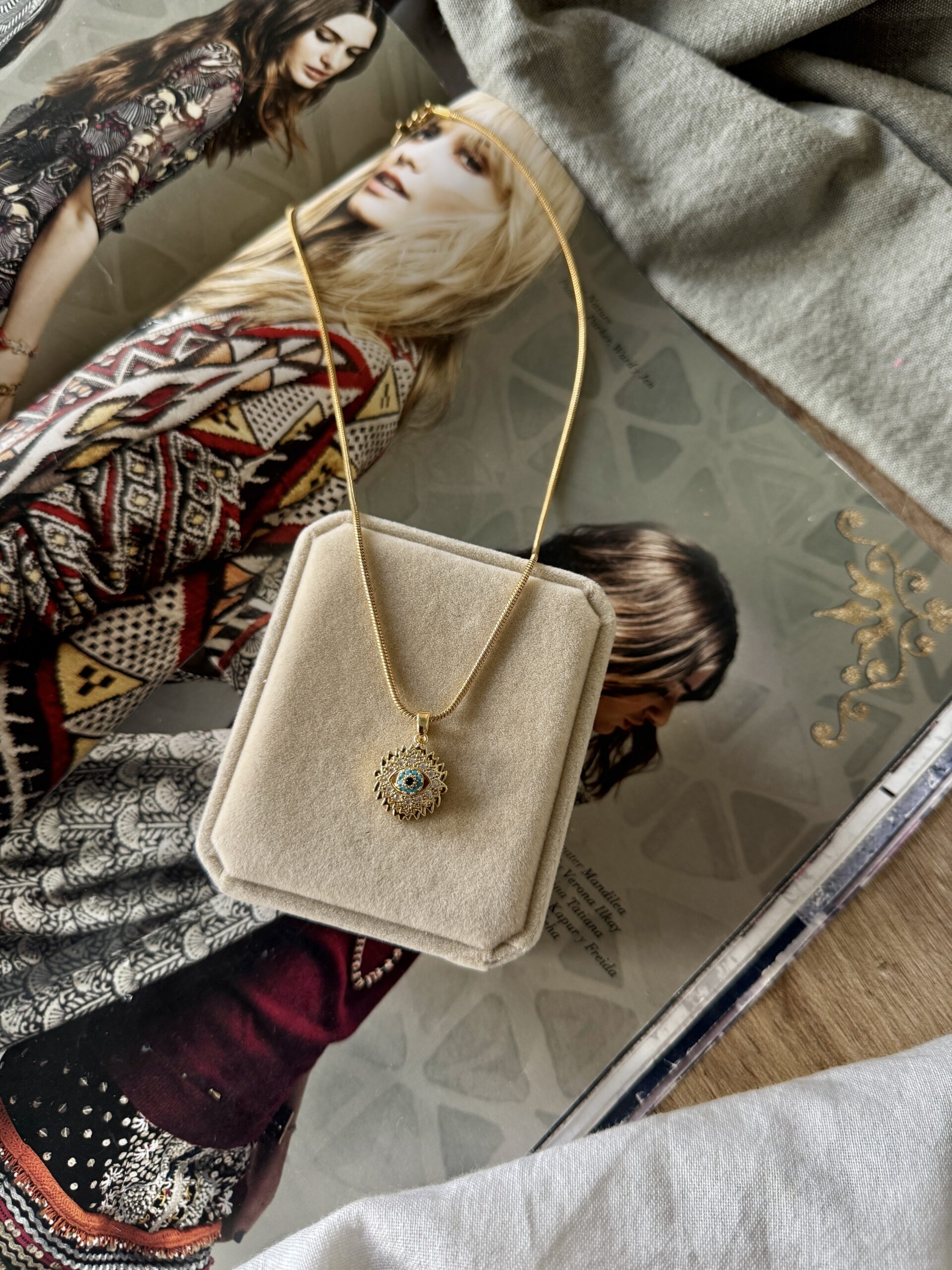 Collar cadena viborita de acero quirúrgico dorado de 42 cm de largo con ojo protector con piedritas incrustadas. El ojito gira!