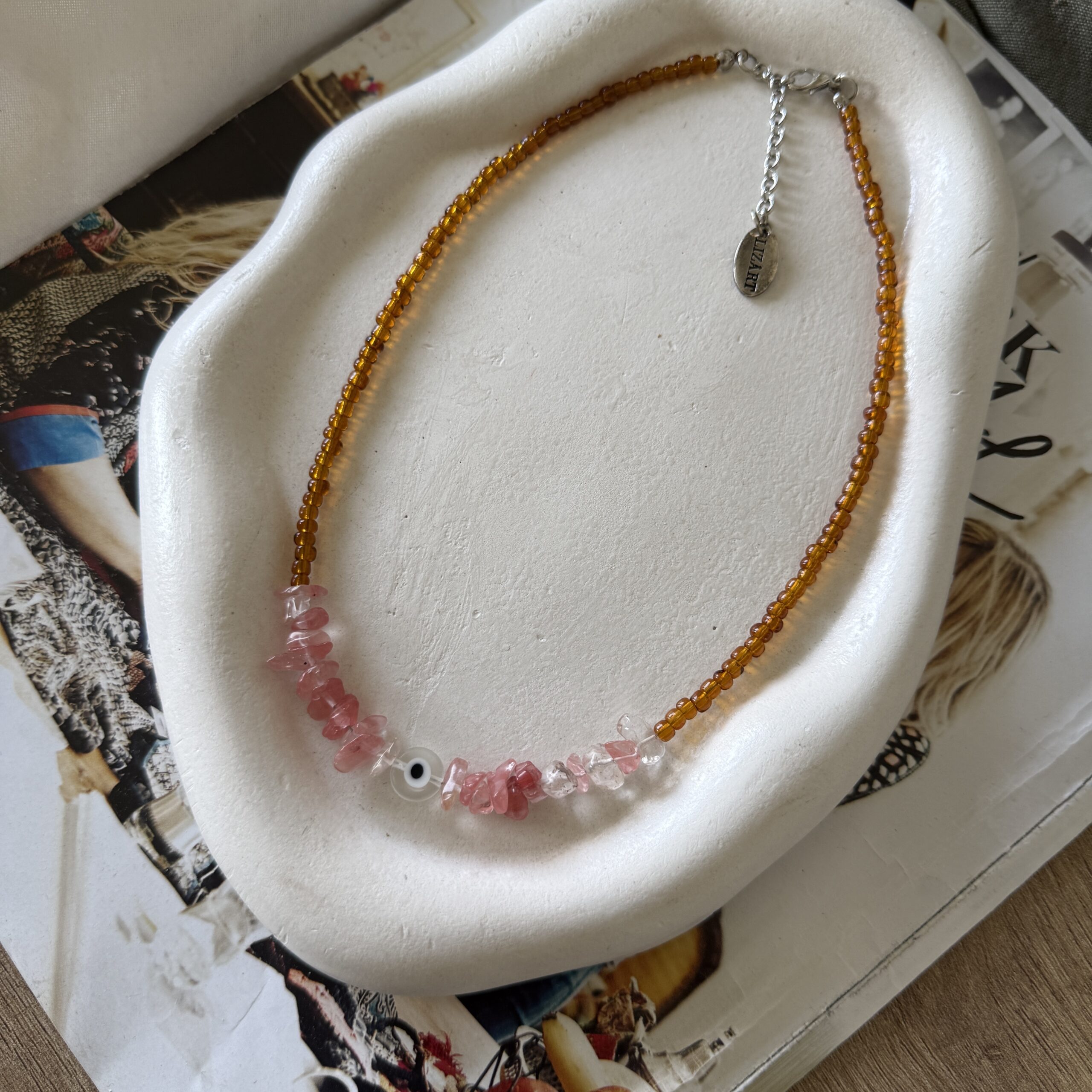 Collar de 42 cm de largo + 5 cm de cadena regulable. Con piedras naturales, mostacillas y ojo protector!