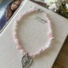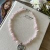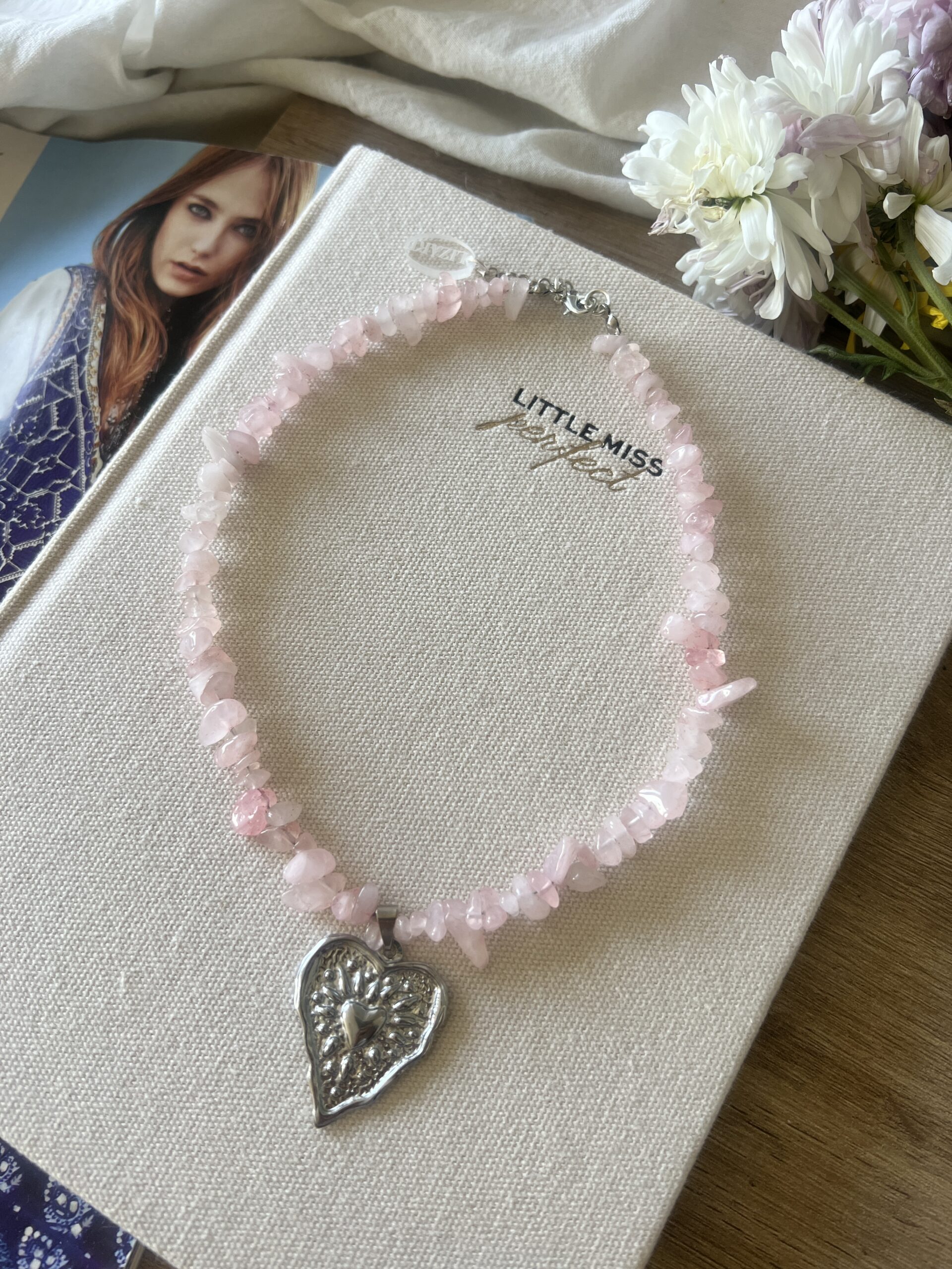 Collar de piedras naturales cuarzo rosa de 40 cm de largo + 5 cm de cadena regulable y dije de corazón de acero quirúrgico.
