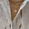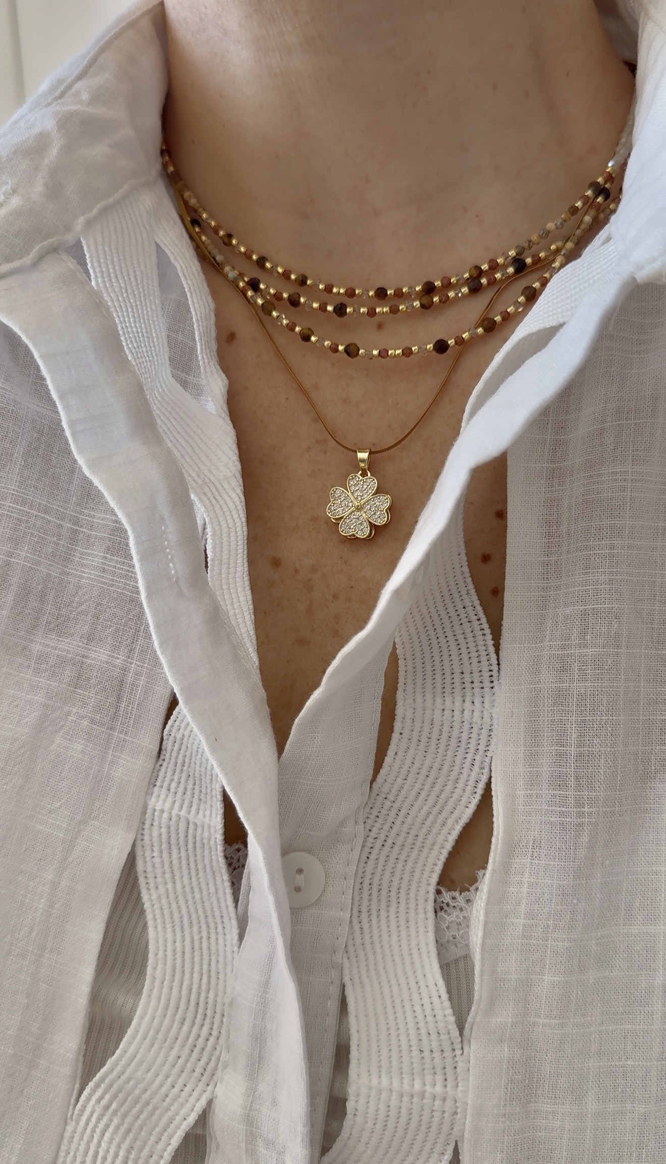 Collar regulable de 43cm de largo + 5 cm de cadena de alargue de acero con mini cristales, piedras naturales y donitas de acero dorado.