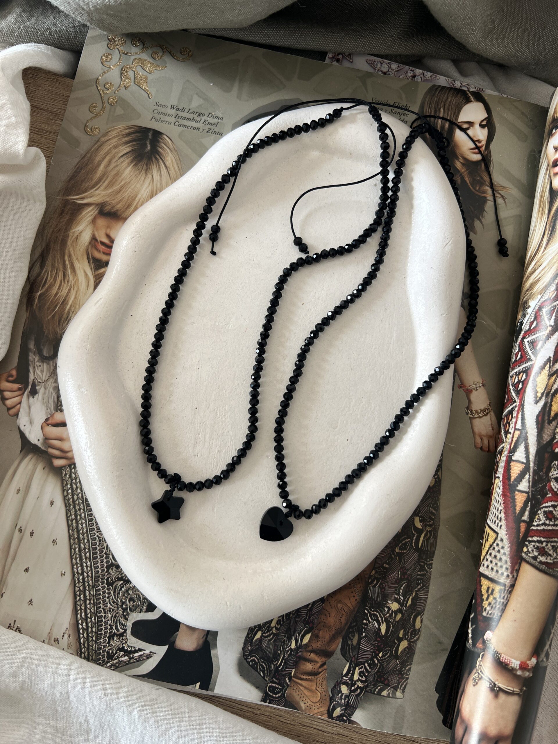 Collar regulable con cristales de roca y dije de estrella o corazón.