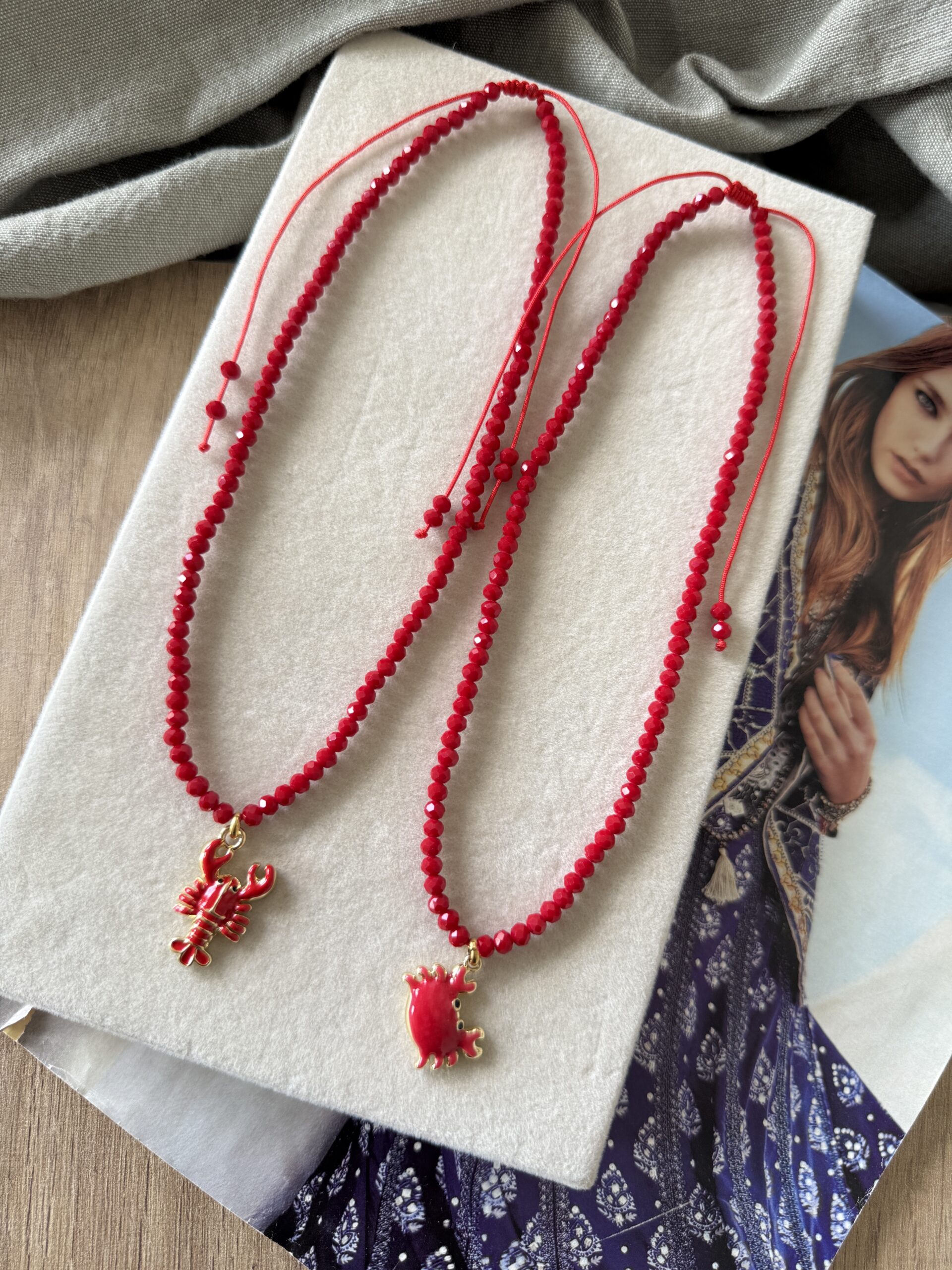 Collar regulable de cristales de roca color rojo con dije de langosta o cangrejo. Lo podes usar largo o corto!