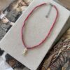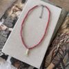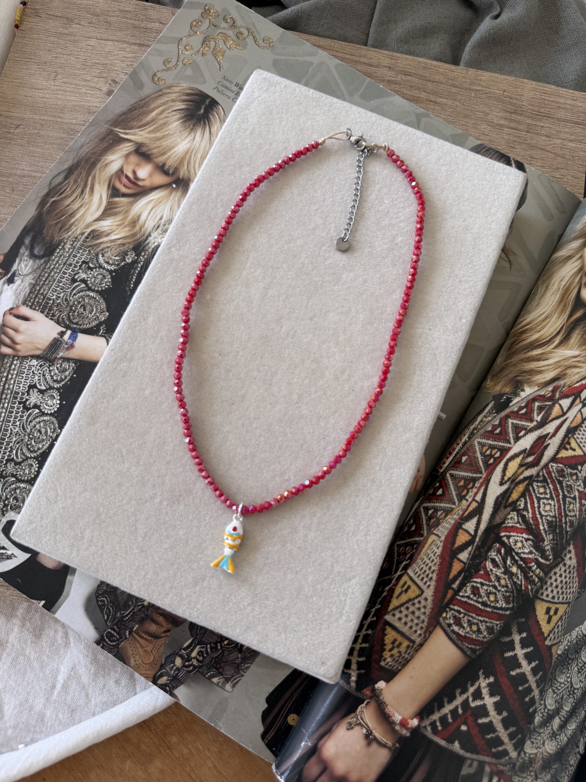 Collar regulable de cristales de roja coral y dije de pez de acero blanco. Mide 40 cm de largo + 5 cm de cadena de alargue de acero.
