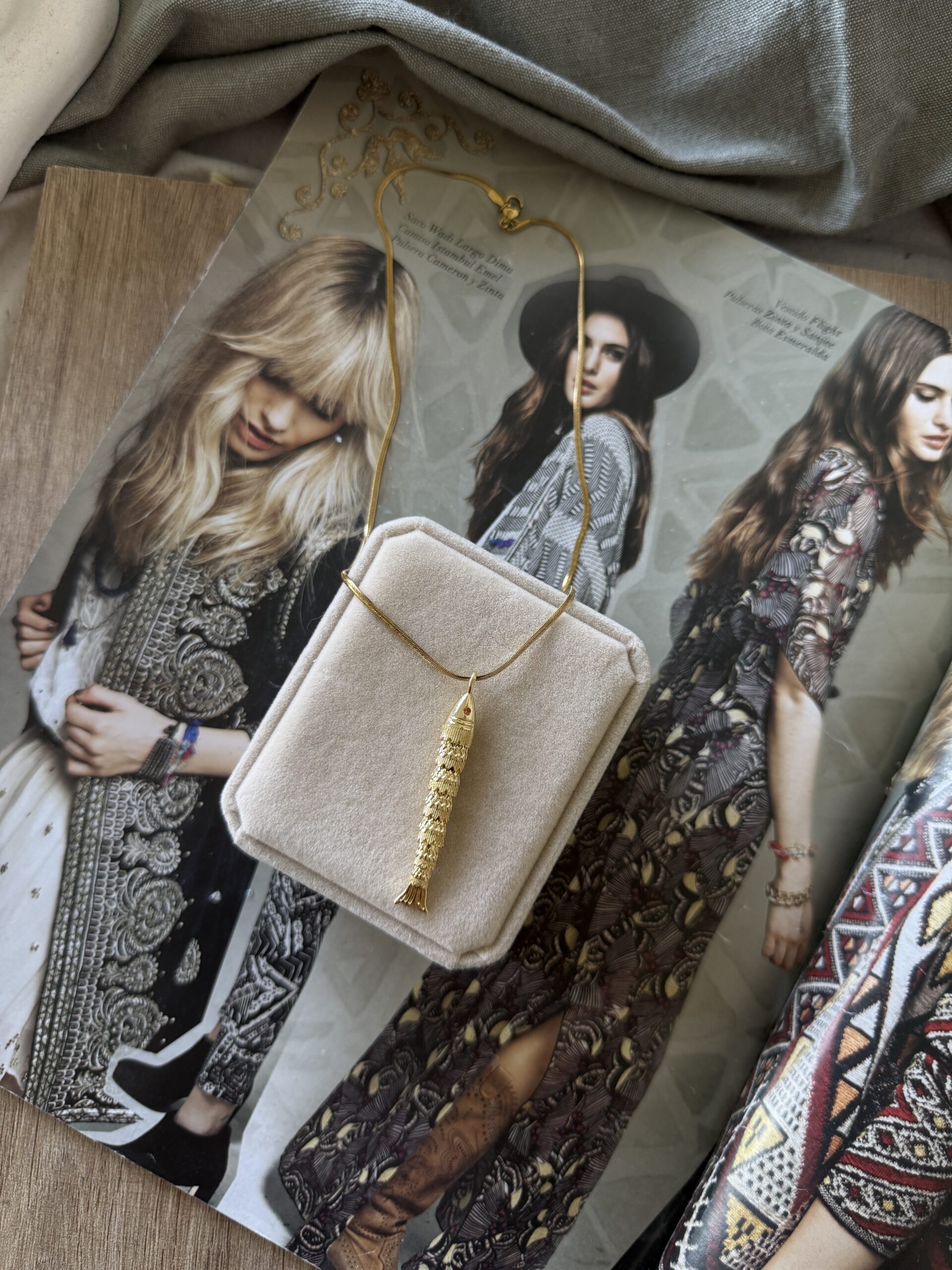 Collar de acero quirúrgico dorado de 42 cm de largo con dije de pez con movimiento.