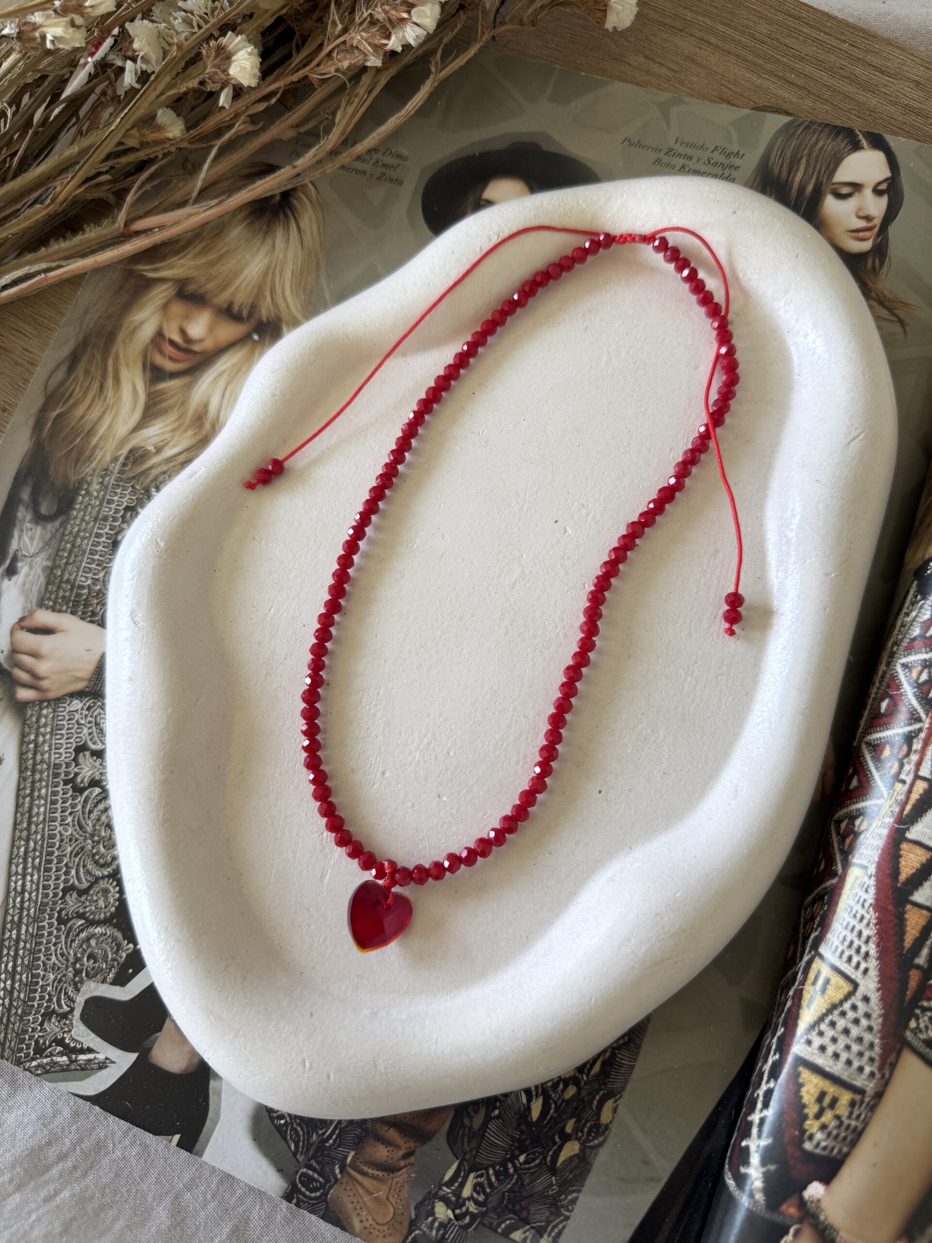 Collar regulable de cristales de roca rojos con dije facetado cristal de corazón. Lo podes usar largo o corto, tirando de las tiras! Resistente al agua!