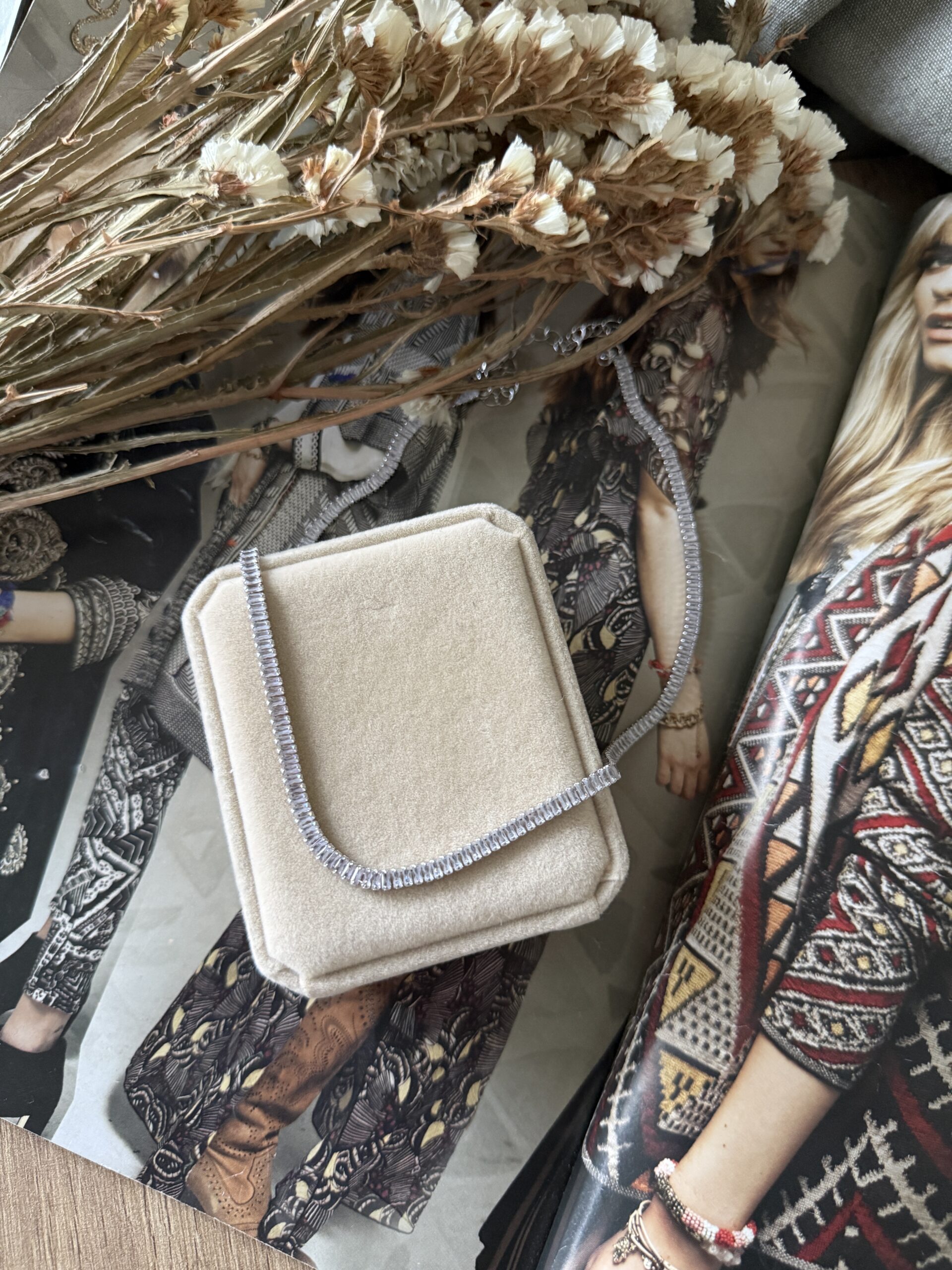Collar de acero de 40 cm de largo + 5 cm de cadena regulable. Color plateado con brillantes.