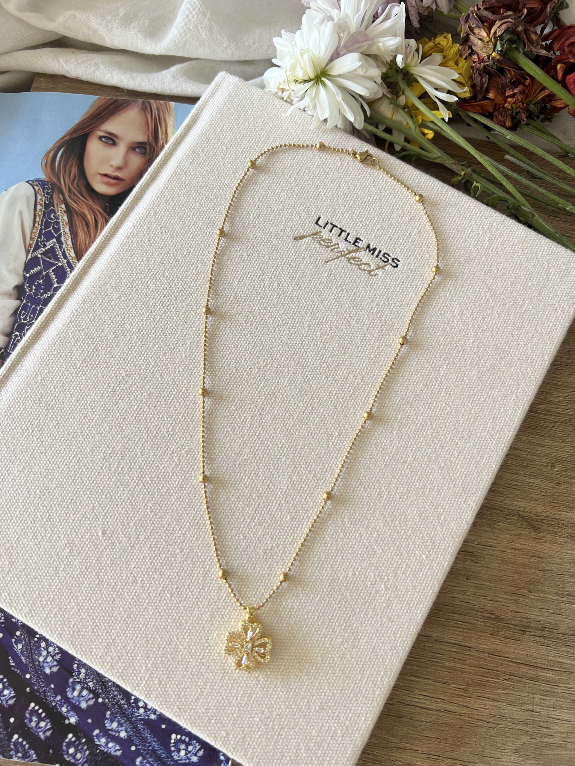 Collar de acero quirúrgico dorado de 45 cm de largo con dije de trébol con cubics.