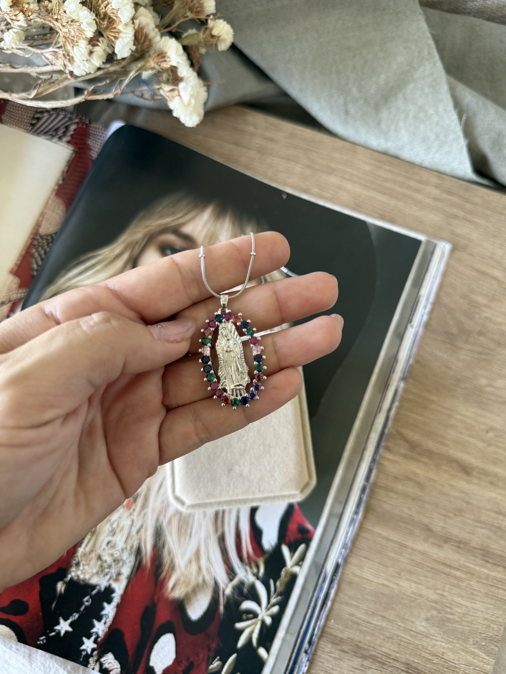 Collar de acero quirúrgico plateado de 45 cm de largo con medalla de la virgen de Guadalupe con piedritas incrustadas.