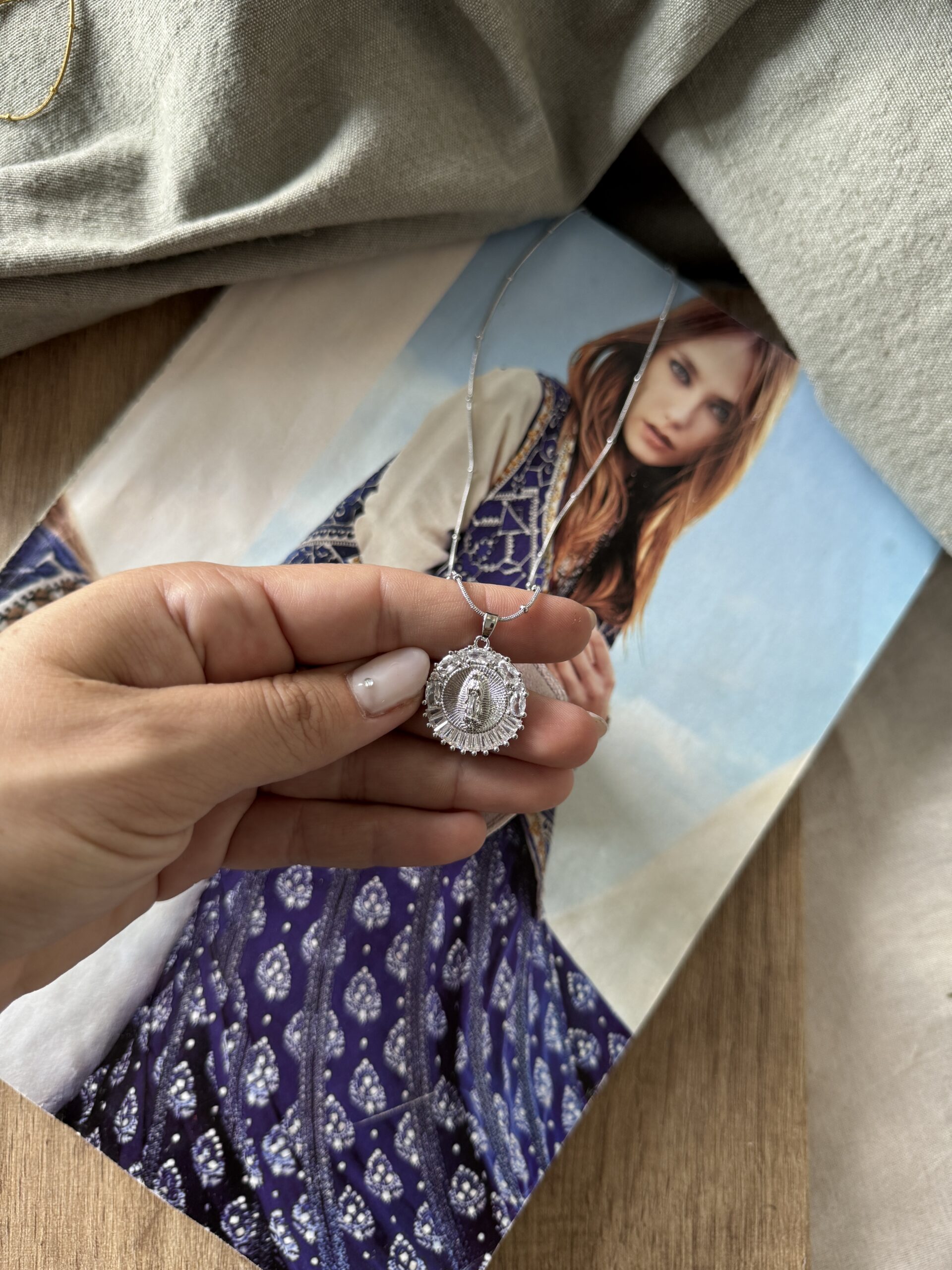 Collar de 40 cm de largo de cadena de acero quirúrgico plateado con medalla de la virgen de Guadalupe con piedritas incrustadas.