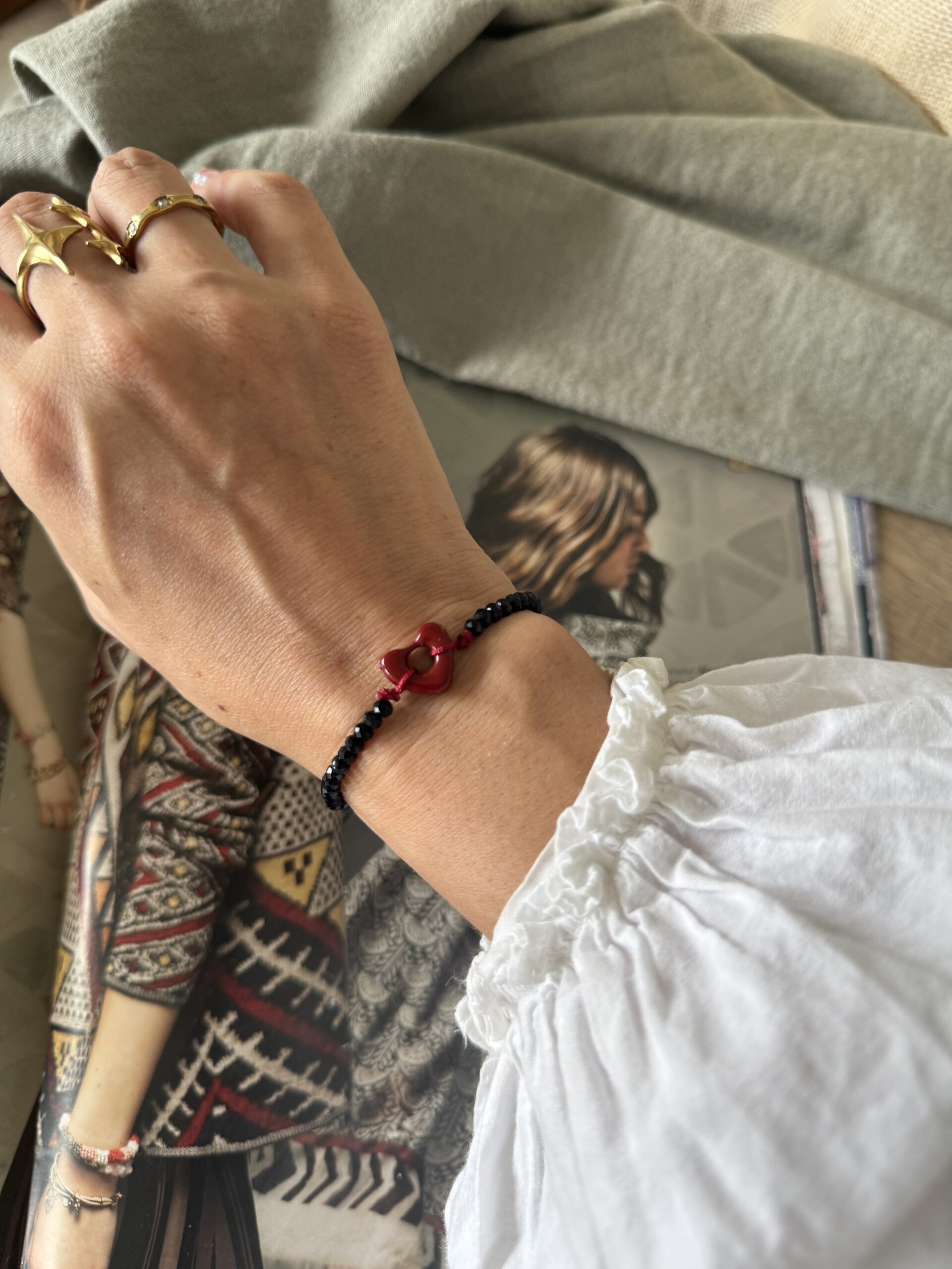 Pulsera regulable de cristales de roca negros con dije de corazón en bordo! Resistente al agua!