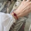 Pulsera regulable de mini cristales de roca bordo con dije de besito en acrílico. Resistente al agua.