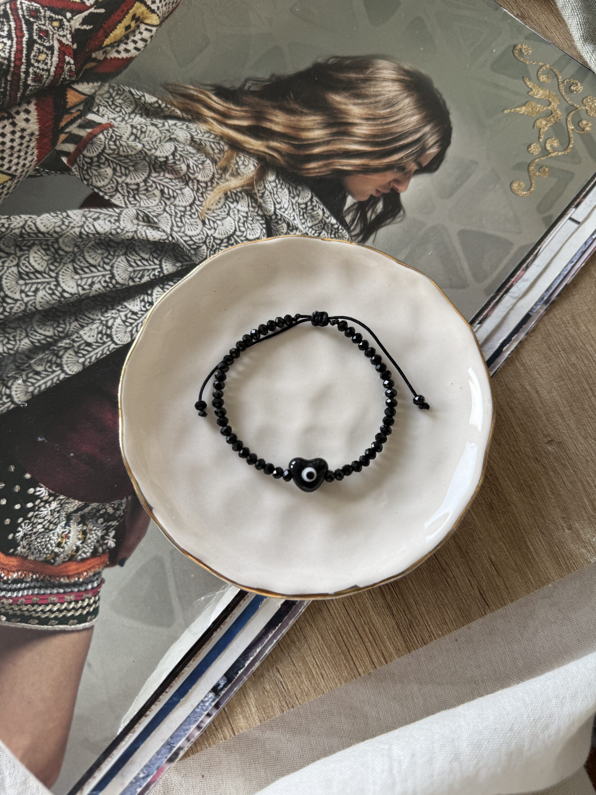 Pulsera regulable de cristales de roca negros con dije de cerámica en forma de corazón con ojito protector! Resistente al agua!