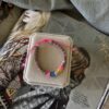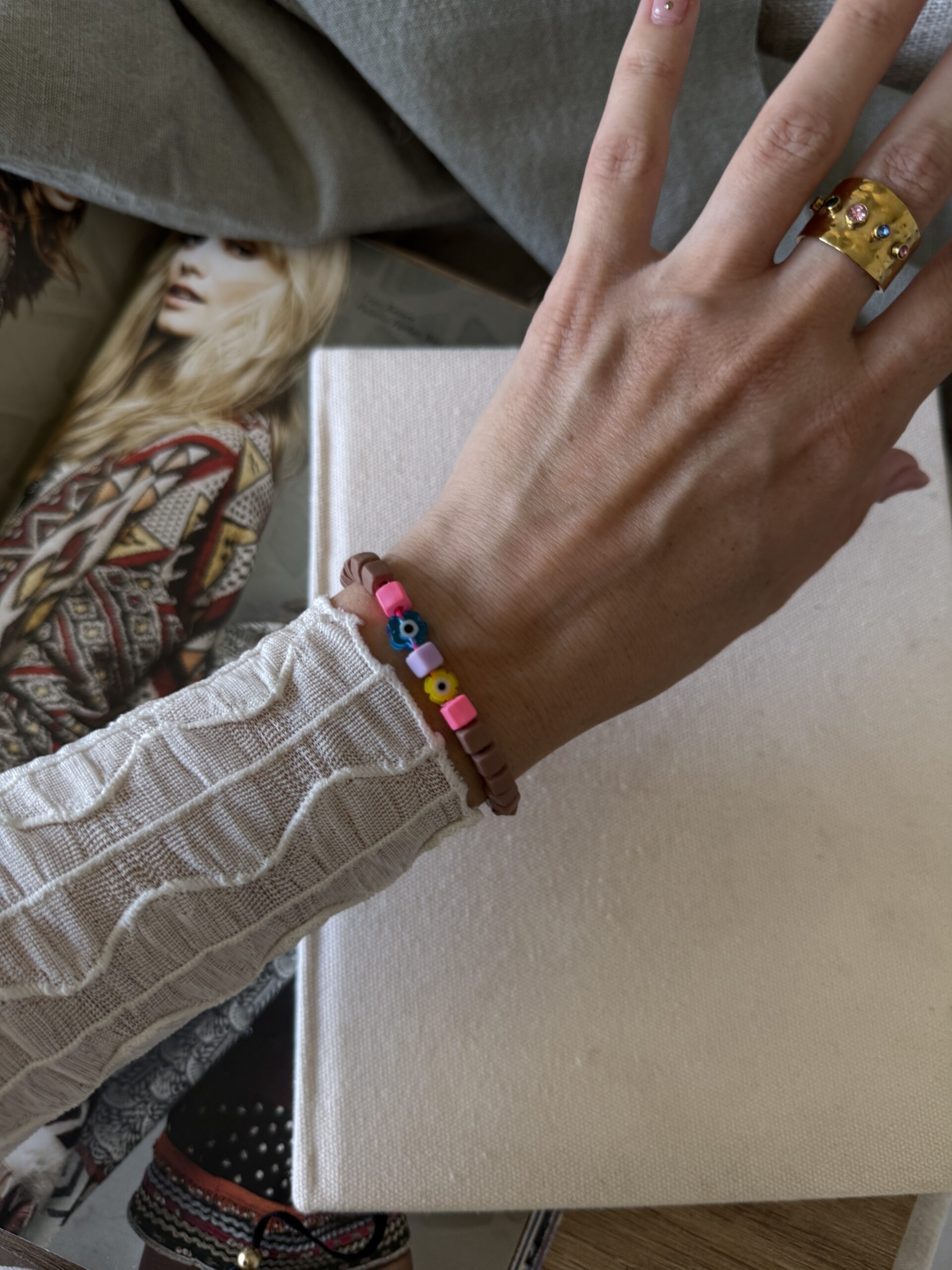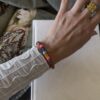 Pulsera regulable de fijos y ojos protectores en forma de florcitas de colores.