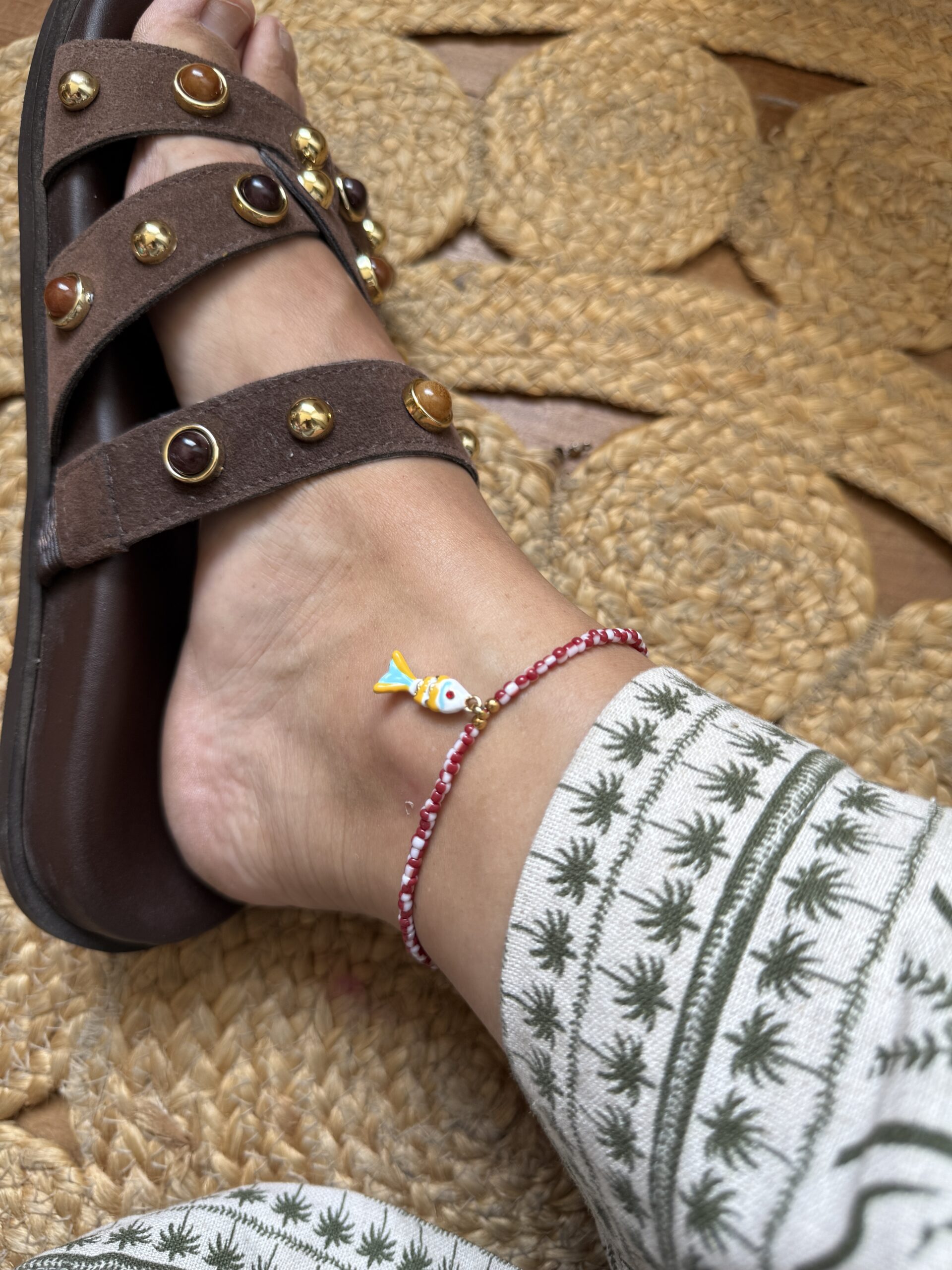Tobillera regulable de mini mostacillas rayadas y dije de pez turquesa.